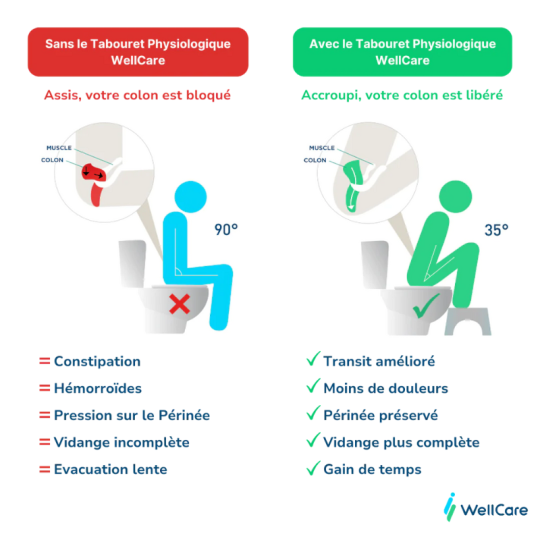 L’utilisation d’un tabouret permet de retrouver cette posture naturelle tout en préservant le confort des WC occidentaux.