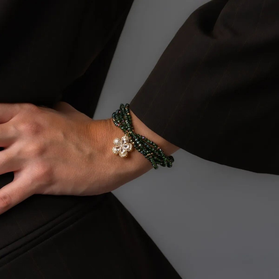 🌸 Mamy dévoile une nouveauté pleine de charme : le MAMY CANELLE, un bracelet en pierres naturelles vertes sublimé par une pampille fleur en strass étincelante. Composé de cinq rangs de perles montées sur un fil élastique ultra résistant, il allie élégance et praticité : facile à enfiler, agréable à porter et toujours stylé.