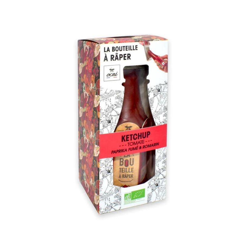 Ingrédients : jus de tomate (32,2%)*, vinaigre de tomate (15,8%)*, Vinaigre de cidre*, sirop d’agave*, jus de pomme*, agar-agar*, sel de Guérande, paprika fumé*, romarin (1,5%)*, gomme de caroube*.