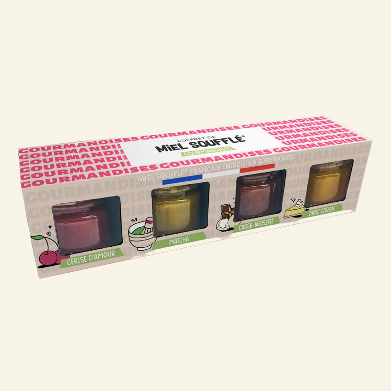 Assortiment de 4 mini Miels Soufflés réunis dans un coffret coloré 100% made in France 🇫🇷 !