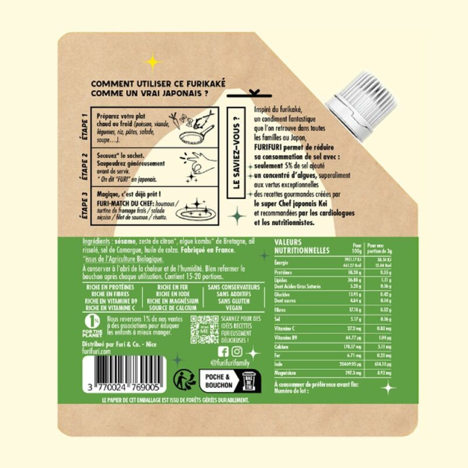 FURIFURI est un furikake 100% naturel fabriqué en France : un super mélange de graines de sésame, algues de Bretagne et plein d'ingrédients très très bons. FURIFURI vous permet de réduire votre consommation de sel et apporte du peps à tous vos encas et petits plats du quotidien !