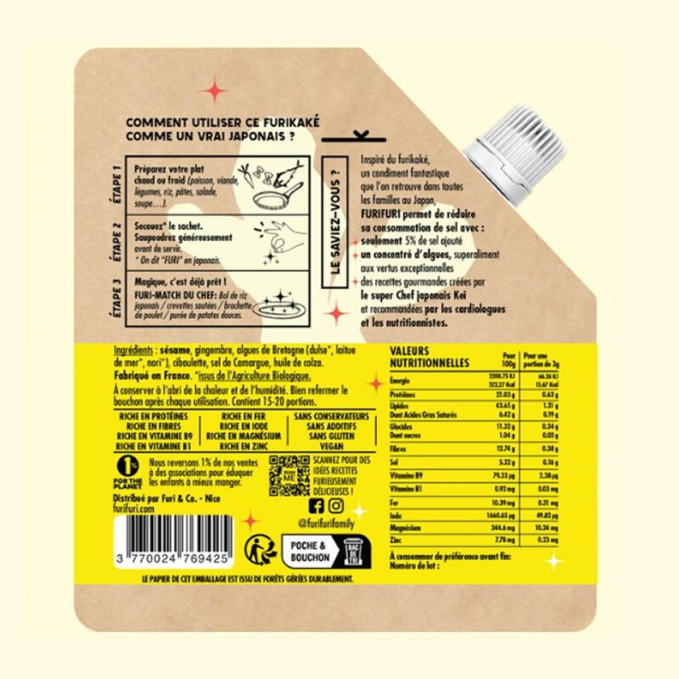 FURIFURI est un furikake 100% naturel fabriqué en France : un super mélange de graines de sésame, algues de Bretagne et plein d'ingrédients très très bons. FURIFURI permet de réduire sa consommation de sel et apporte peps, goût et croquant à tous les encas et petits plats du quotidien !