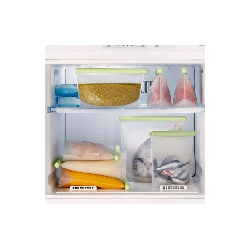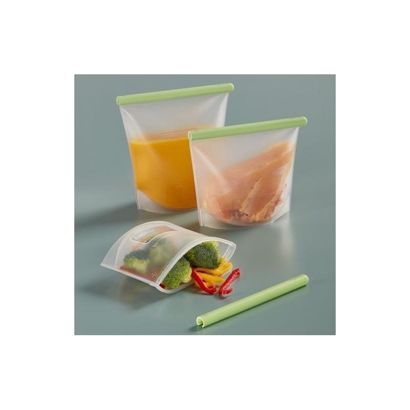 Utilisez ces sacs réutilisables en silicone platine, pour la conservation et le stockage hermétique des aliments solides ou liquides dans votre réfrigérateur, votre congélateur ou dans les placards de la cuisine. Une alternative écologique aux sacs plastique jetables et aux contenants en plastique à usage unique !