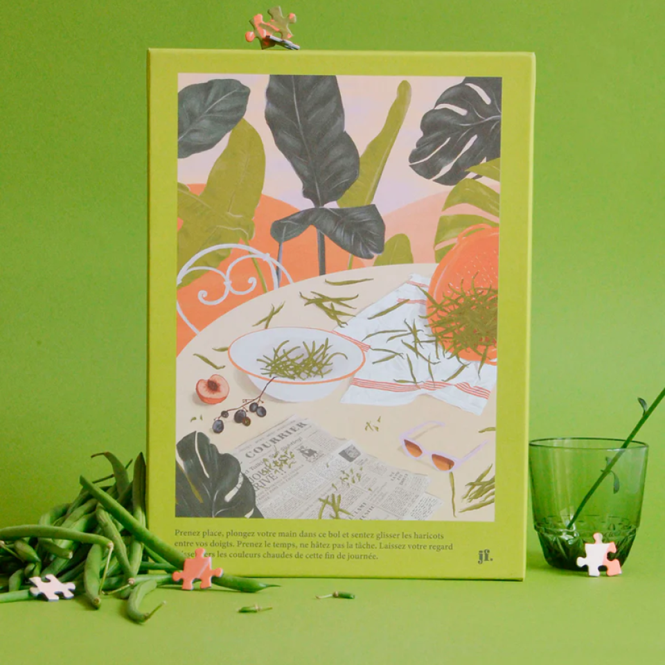 🧩 Ce puzzle de 1000 pièces vous transporte dans un décor bucolique où se déroule une studieuse séance d'équeutage de haricots verts. Un journal, une simple chaise de jardin et une poignée de haricots pour vous laisser aller au souvenir d'une chaude journée d'été...