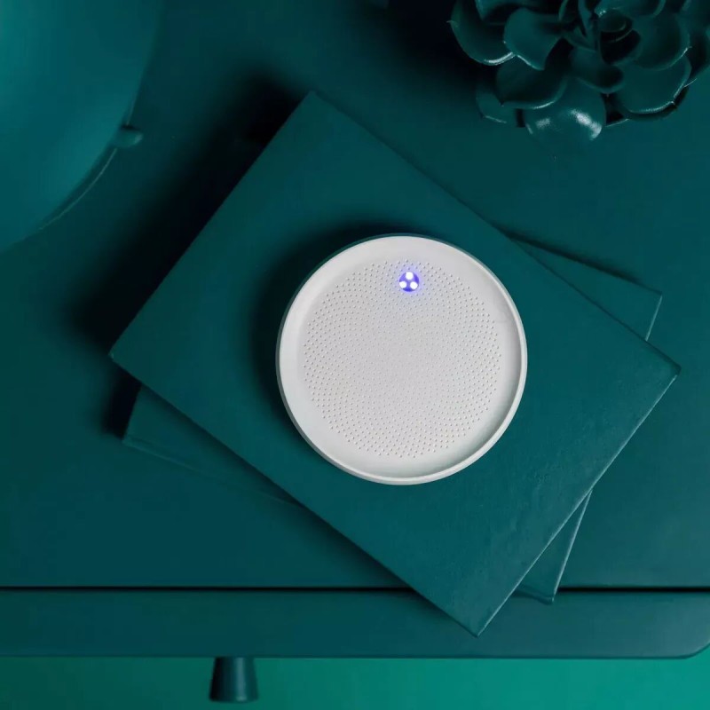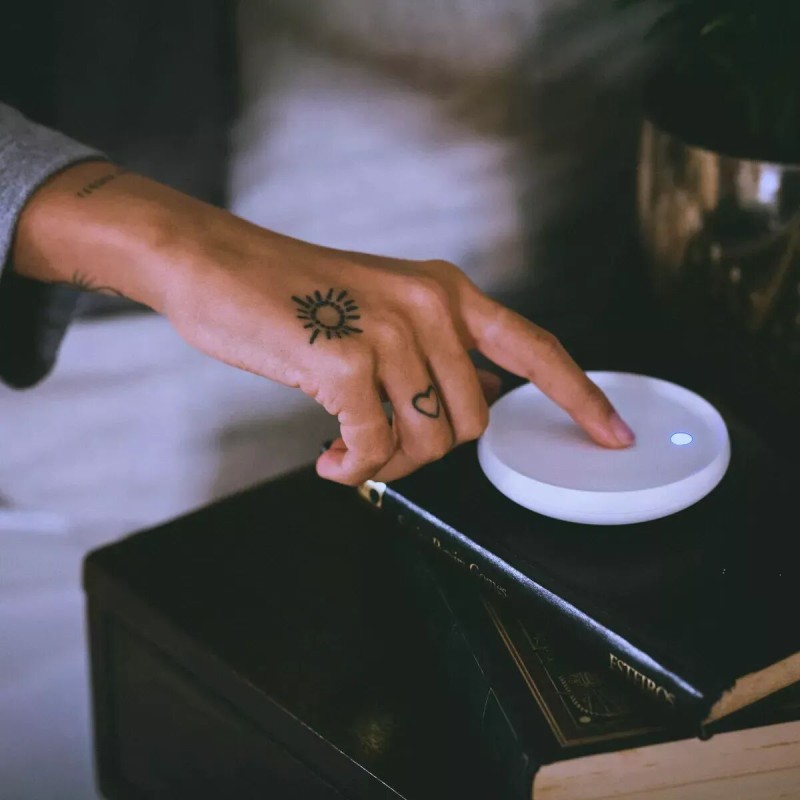 Touchez la surface tactile une fois pour le mode de 8 min et deux fois pour celui de 20. Synchronisez votre respiration avec la lumière bleue projetée sur le plafond. Inspirez quand elle s'étend...