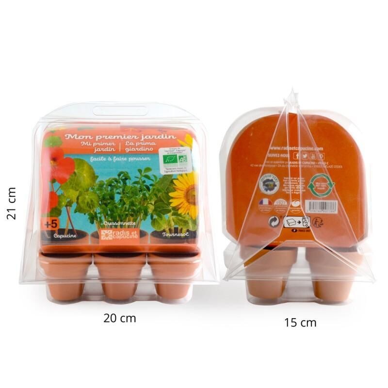 🌸 Mini serre pour faire germer et pousser à la maison 3 graines reproductibles à semer : Tournesol bio, Cresson Bio et Capucine naine bio. Kit complet avec pots, terre et semences.