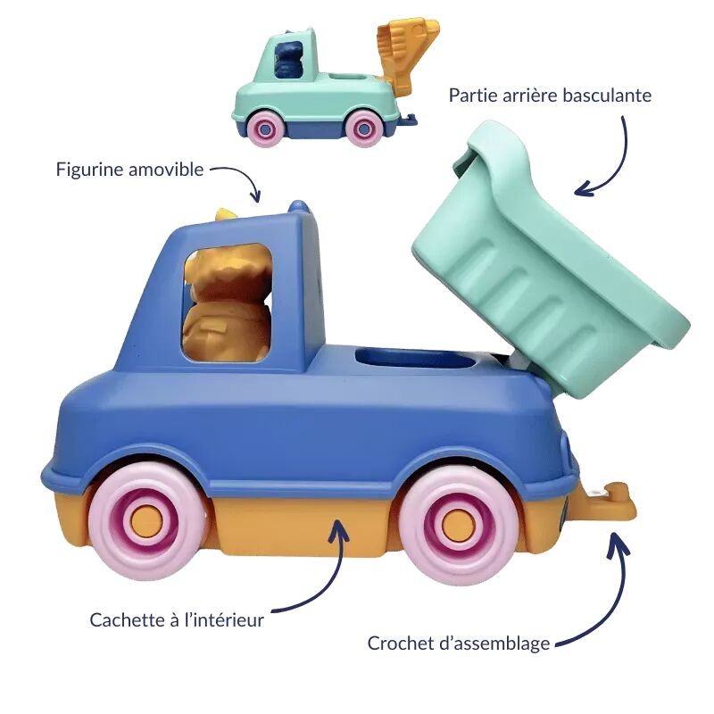 Le design, le poids et les couleurs des camions sont pensés pour les petites mains des enfants. Nous recommandons de toujours jouer sous la surveillance d'un adulte.