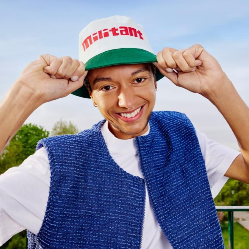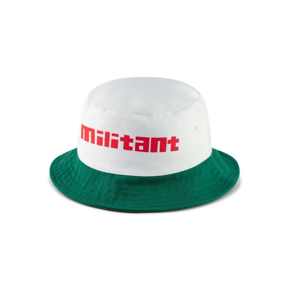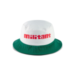 Le bob MAIF Héritage se distingue par son coloris blanc cassé, complété par un bord vert signature MAIF. L’inscription du mot « militant » et ses déclinaisons en rouge vif Pantone 032 C sur le devant, ce chapeau incarne l'engagement.
