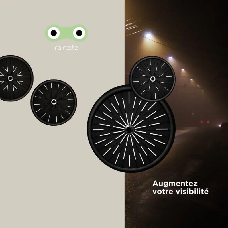 L’idée est née d’une volonté d’effectuer des trajets à vélo par n’importe quel temps et en toute sécurité : les accessoires disponibles en ce sens sont souvent inesthétiques. Rainette, société spécialisée dans les accessoires réfléchissants pour vélo, casse les codes. Rayons, lacets, stickers…