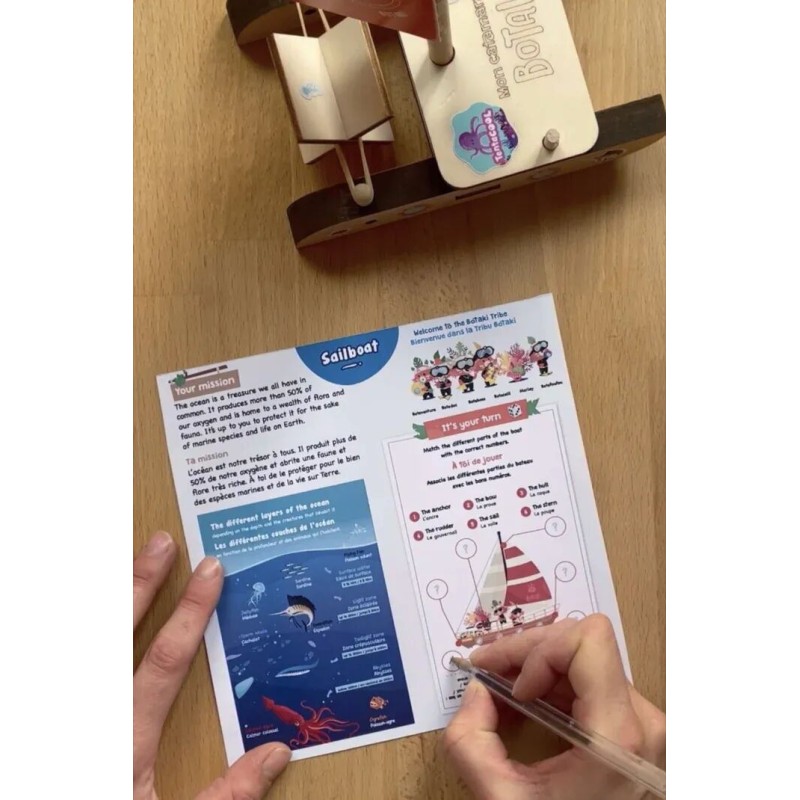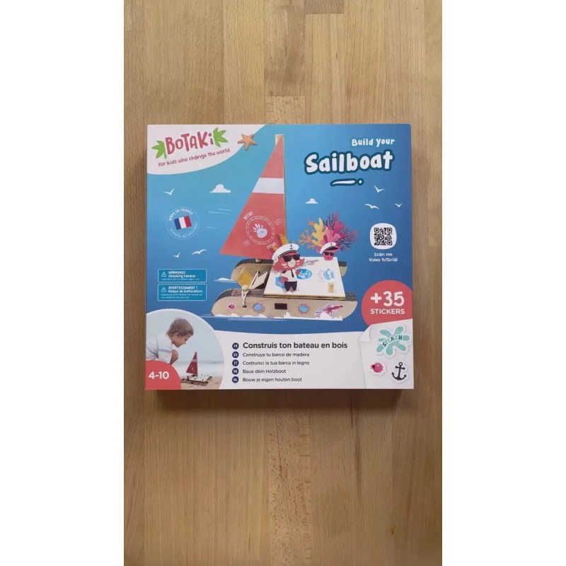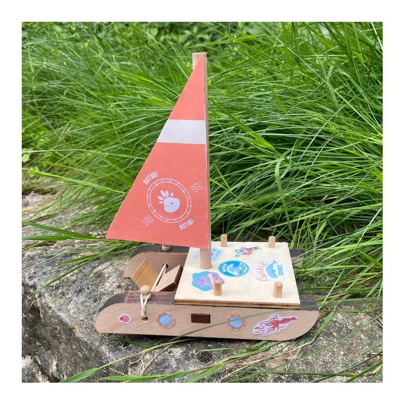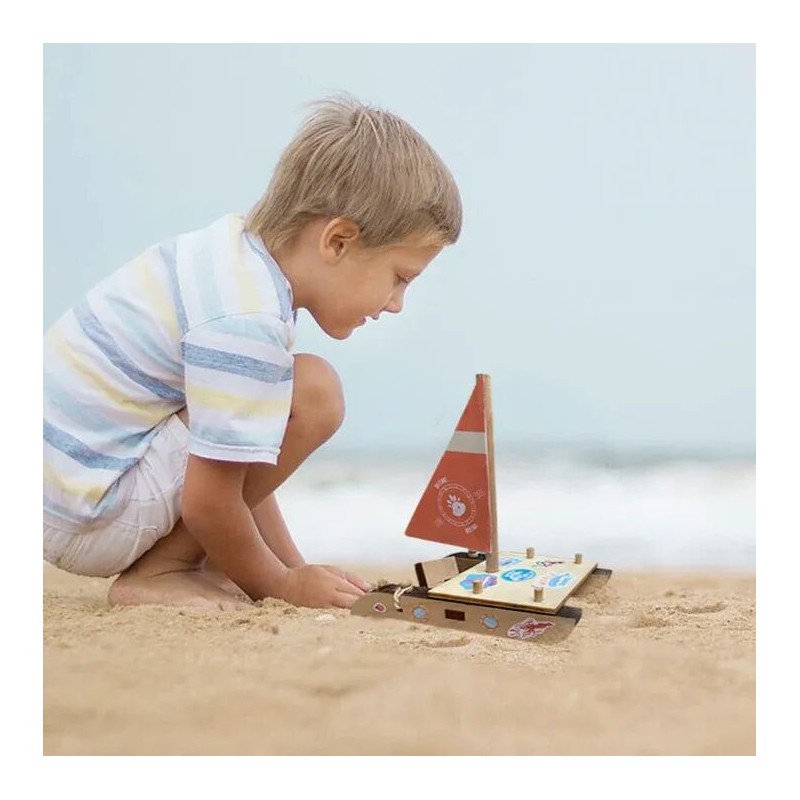🛥️ Avec ce kit de construction sur l’océan, les enfants fabriquent un catamaran en bois. Une fois le montage terminé, ils peuvent le décorer avec la voile et les stickers résistants à l’eau fournis.