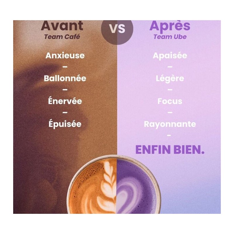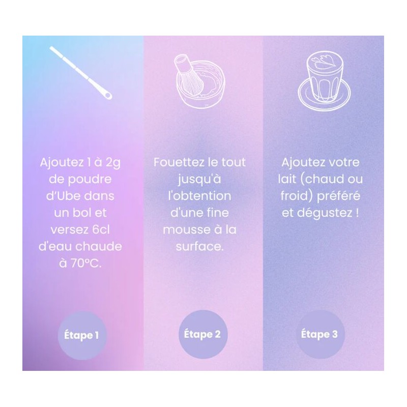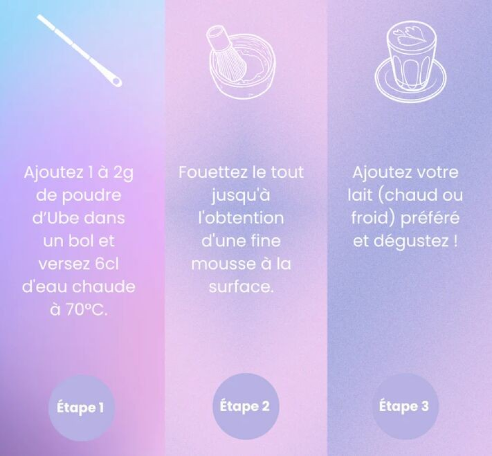 - Mélangez la poudre d'Ube à vos boissons, smoothies, porridges ou desserts préférés : mélangez, chaud ou froid. L'Ube se dissout facilement. Il se savoure aussi bien en boisson chaude qu'en version glacée.