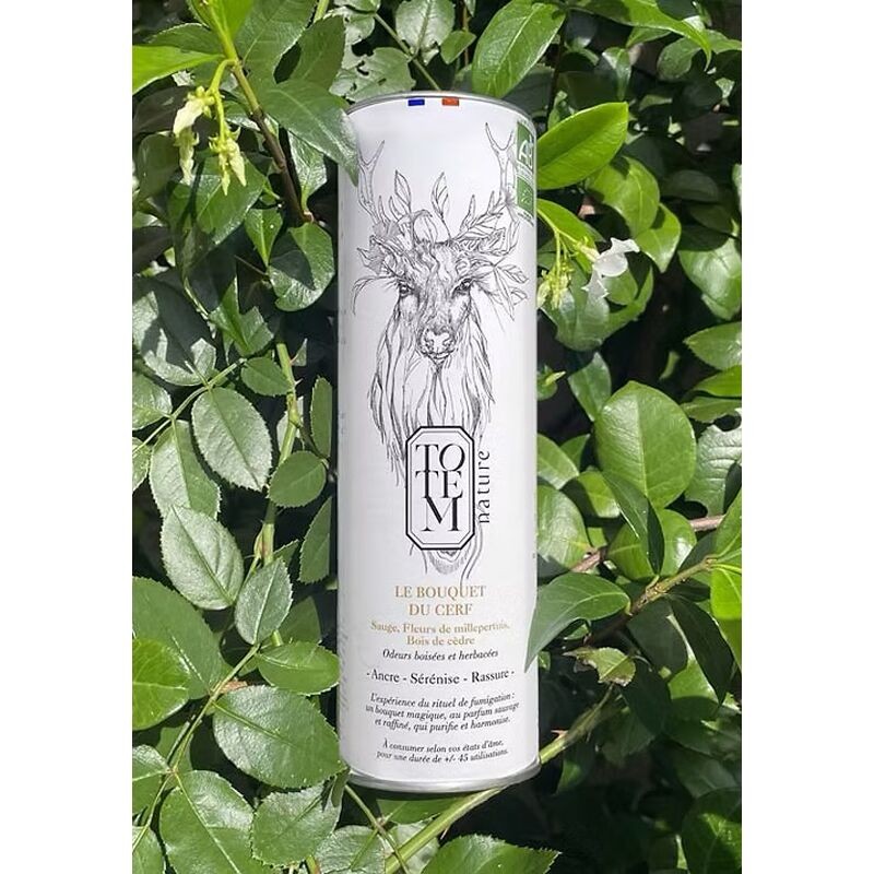 Cerf : INGRÉDIENTS : sauge*, millepertuis*, bois de cèdre. Lien de coton bio respectant le cahier des charges GOTS.