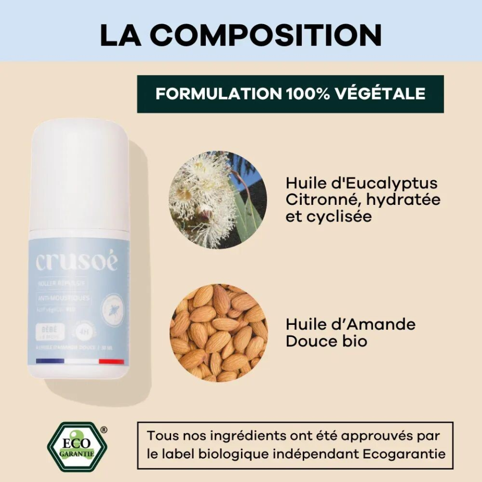 🌿 Notre Roll-on Anti-moustiques Bébé formulé avec de l'huile d'amande douce bio, présente une concentration diluée en actif répulsif afin de respecter les peaux les plus fragiles.