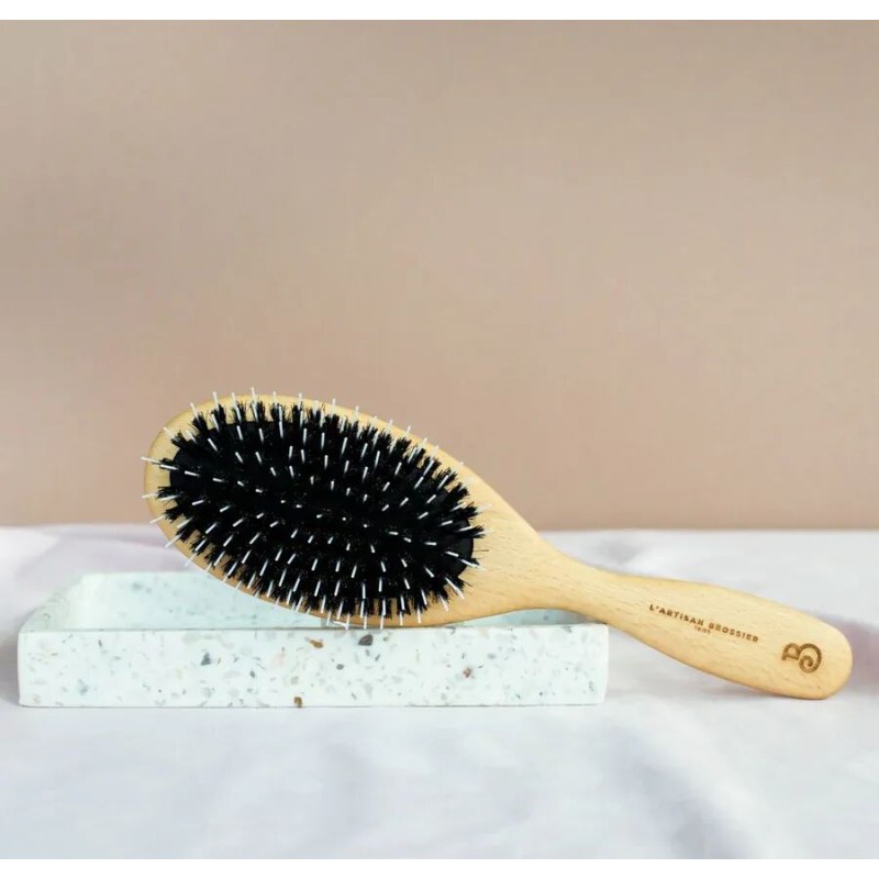 La brosse Julia apporte un soin aux cheveux grâce à ses poils de sanglier, démêle efficacement et masse le cuir chevelu grâce à son coussin pneumatique en latex naturel.