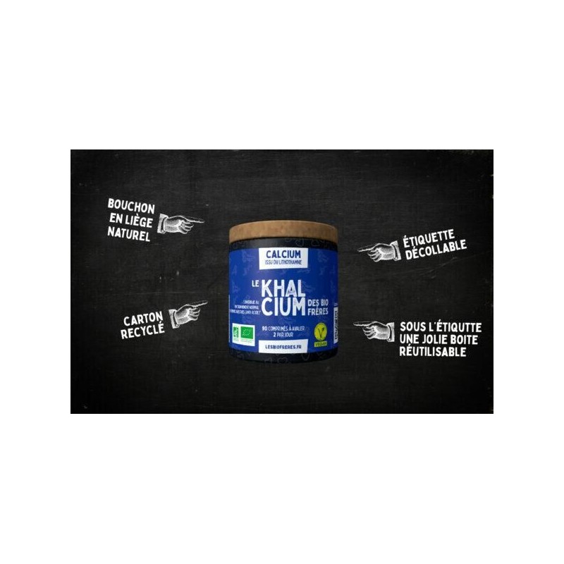 Pour limiter les déchets, Khalcium est conditionné dans un pilulier en carton recyclé, qui ne contribue pas à la déforestation, avec un couvercle en liège naturel recyclable à vie.​