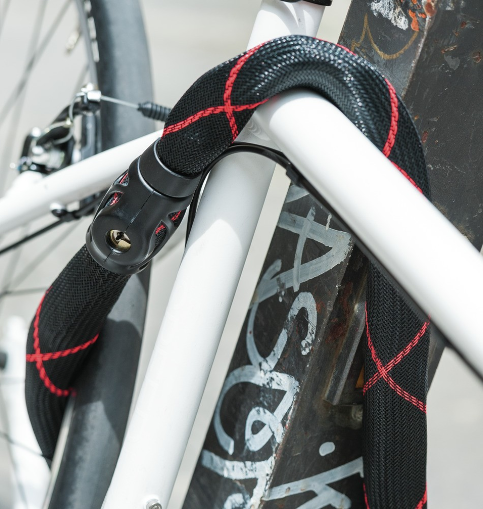 - Chaine carrée à maillons de 10 mm de diamètre recouverte d'une gaine en mailles durable et hautement flexible, pour protéger la peinture du vélo