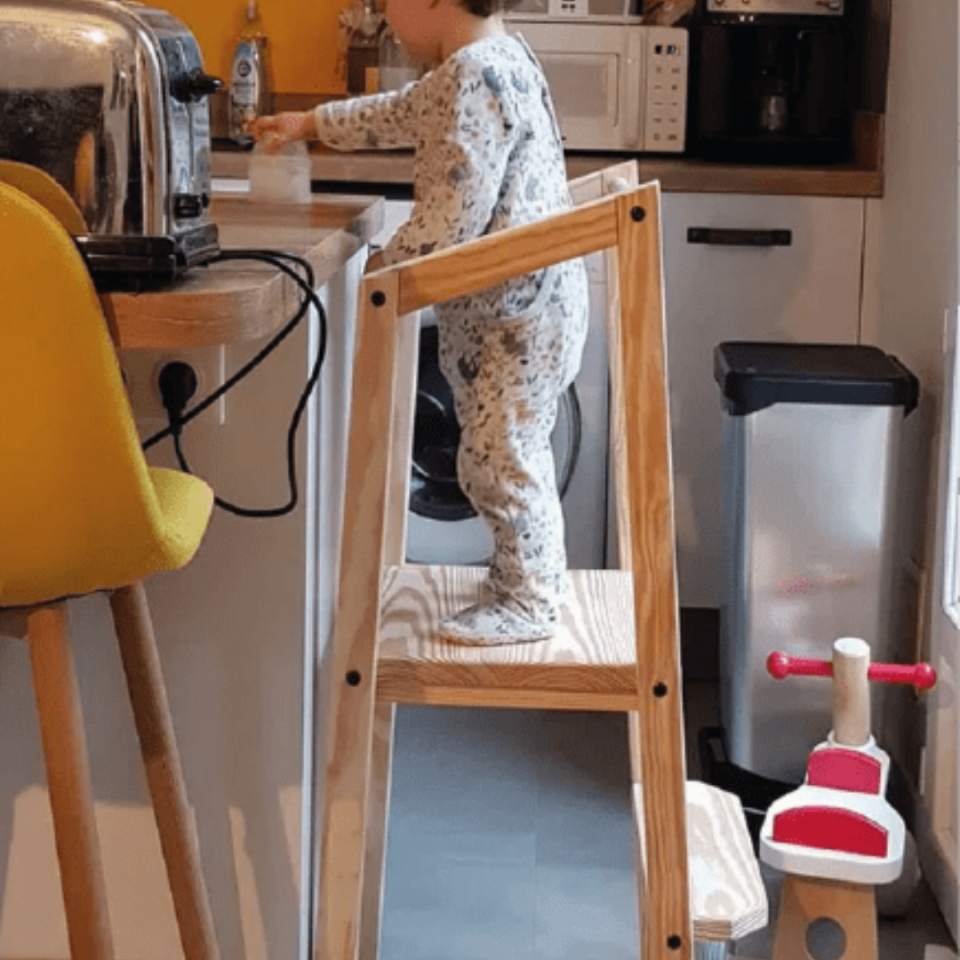 Produit emblématique de la Fabrique des Potirons, la tour d’observation Montessori fut la première création. A l’origine de cette invention était la problématique de faire participer les enfants à la vie quotidienne des parents en sécurité et pour le développement de leur autonomie. C’est alors que la tour d’apprentissage est née, dans un premier temps avec l’accueil d’un seul enfant. Ainsi avec la tour d’observation votre enfant peuvent participer avec vous à la cuisine, faire des activités manuelles, se brosser les dents… en bref découvrir la vie. Eco-conçu, la tour est un produit éco-responsable soutenant l’économie sociale et solidaire. Avec son bois naturel, elle se fond parfaitement dans tous les styles de décoration de votre intérieur.