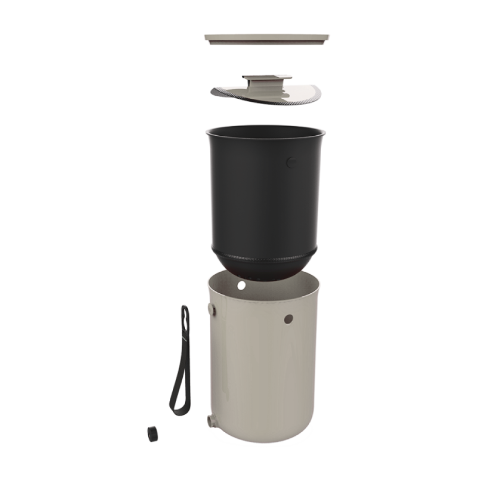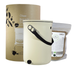 Ce seau à bokashi a une capacité de 9,6 litres, son design est épuré. La coque blanc-cassé accueille une coque interne noire qui intègre un tamis.